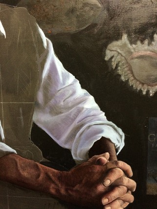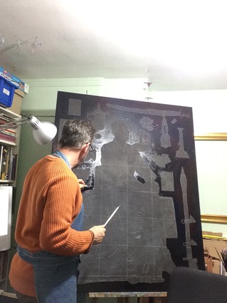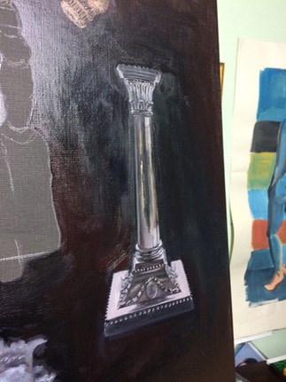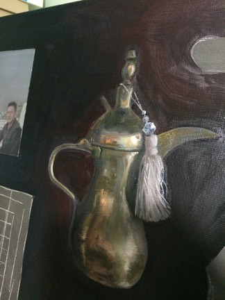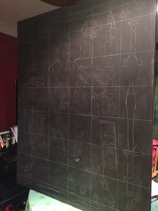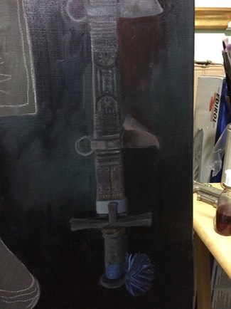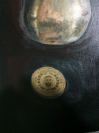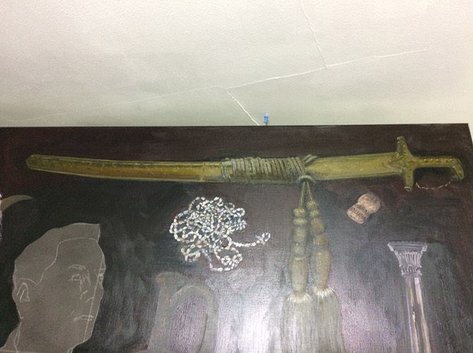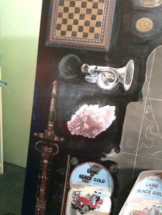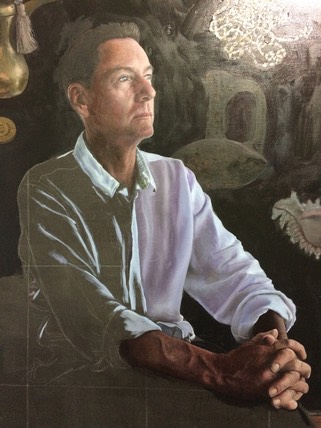 The idea for the composition came to me after I visited Frank's appartment. There is a huge main room, with two of the walls made entirely of glass and positioned all around on the furniture and remaining walls is a fascinating collection of artifacts and souvenirs from Frank's travels around the world. I felt that including these somehow would tell an interesting story. Rather than placing the object conventionally in the background, I decided to float them abstractly in an effort to convey the feeling I got when I first walked into the room. This painting has made it into the final round of the BP Awards Portrait Competition 2015, so I would like to keep it under wraps for the time being. Therefore on this page I am just putting a series of photos briefly documenting the development of this painting up to the final delivery to the NPG repository…
